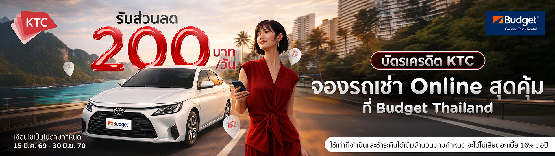 - Pre-payment & Booking: Book and pay in advance using KTC VISA, MASTERCARD, or JCB credit cards via https://budget.co.th/Bank/?PartnerCode=BUDGETKTC200. The physical card used for booking must be presented to staff on the pick-up date for a security credit limit hold. Bookings are subject to vehicle and branch availability.